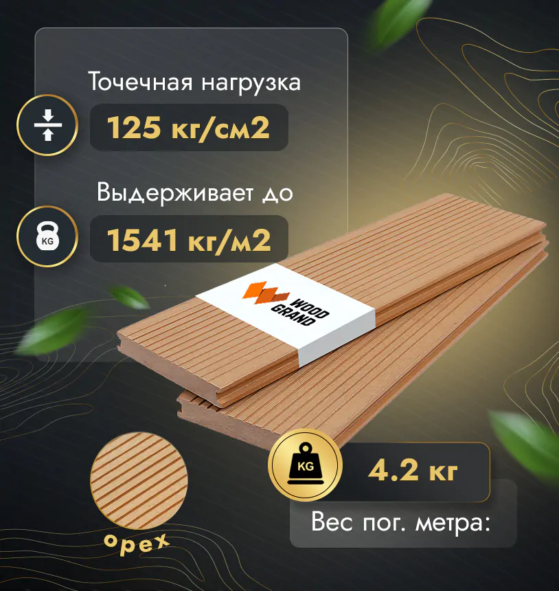 Плотность составляет до 1631кг/м3. Доска из МПК в профиле 150x22 мм прочнее, чем ДПК 200x24 мм.